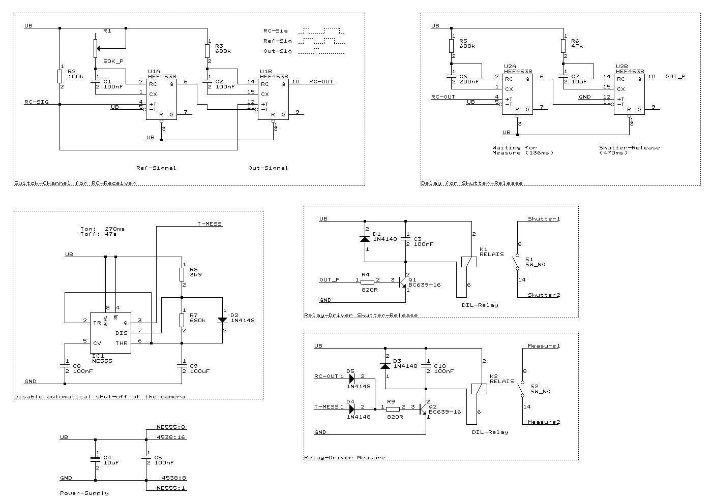 Two timers of the second HEF4538 (U2) are for the delay of the switch for shutter release after the switch of measurement. With the signal RC-OUT the timer U2A starts for the delay. After the delay time U2B is for 470ms active to close the switch for shutter release.